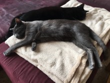Ze zijn dol op hun eten en de gierigheid die je altijd hoort van andere katteneigenaren bestaat hier niet. Ze eten altijd alles meteen op. We geven ze vijf porties per dag onder toezicht, zodat iedereen echt zijn deel krijgt en niet één kat alles krijgt ;)