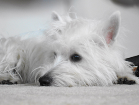 Tot op dit moment kreeg Andy al 11 jaar droogvoer. Mevrouw Zintl vertelde ons dat droogvoer absoluut niet geschikt is voor zijn diersoort. Zoals we al bij Andy hadden gezien, was hij al volledig verkleurd door de vele conserveringsmiddelen in het droogvoer. Zijn vacht was niet meer wit, wat de kleur van een West Highland Terrier zou moeten zijn, maar was bruin geworden en was al zwart tussen zijn tenen. Andy's allergie onder zijn buik was ook, zoals mevrouw Zintl zei, een typisch effect van droogvoer. We wilden Andy natuurlijk helpen en vertrouwden op Anifit en bestelden meteen een regelmatige maandelijkse voorraad natvoer.